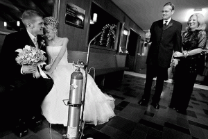 Um acessório inusitado na festa foi o tubo de oxigênio usado por Katie. Ele acompanhou a noiva em toda a cerimônia e na festa também.
