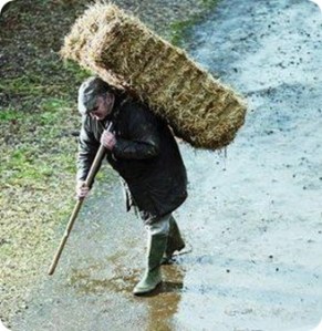 Um homem caminhava vacilante pela estrada, levando uma grande pedra numa mão e um tijolo na outra. Nas costas carregava um saco de terra; em volta do peito trazia vinhas penduradas.