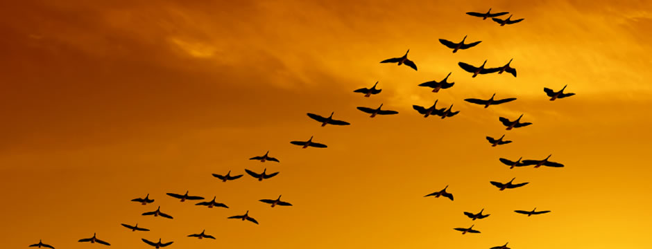 gansosQuando um ganso bate as asas, cria um “vácuo” para o pássaro seguinte. Voando numa formação em “V” o bando inteiro tem o seu desempenho 71% melhor do que se a ave voasse sozinha.